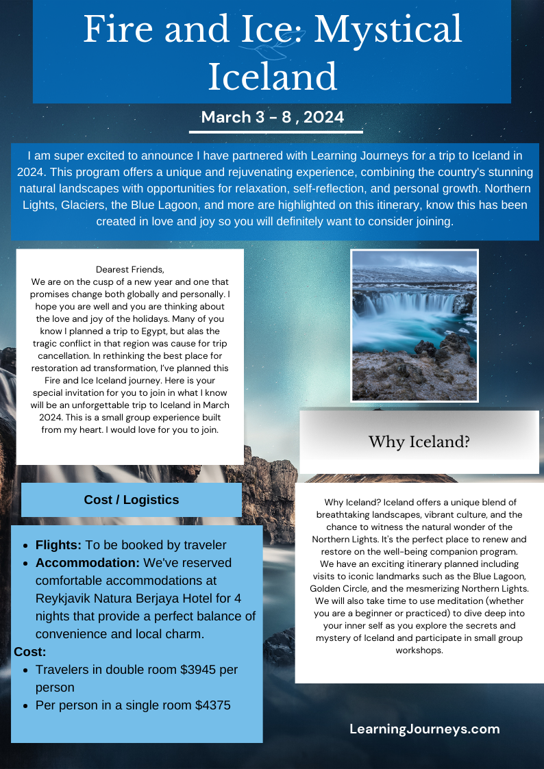 It’s about you right now. “How many times do we say, oh, maybe next time?” Well, a small group of women decided to say, “Yes, this time!” They took the opportunity to engage in a magical well-being transformative journey full of spiritual connection and healing in the wildness and magic of the moment. We were immersed in a 5-day intensive retreat experience. Iceland is truly mystical and full of beauty. We didn’t “see” the Northern Lights, but we knew the light show was there behind the clouds. We stood over the tectonic plates where the earth split, opened to the new. We left everything behind and opened our hearts to hear our inner voice. We trekked into the heart of a glacier one behind the other guiding and supporting each other as we walked inside ice paths and caves. You were in Gaia, Mother Earth’s inner sanctum. We bathed in the thermal flows and in the Blue Lagoon, swam up to the “mask bar” and then into a sauna / steam caves overlooking the Atlantic Ocean. We talked about how all of the stress we were carrying left our bodies, Hallelujah. Outside of Grindavik we saw fresh lava flows, new Earth, untouched by human influence. That’s what we felt like—new, fresh, ready to create. What a mystical, transformative way to reignite, to restore and manifest our deepest desires. Maybe you will join us next time.